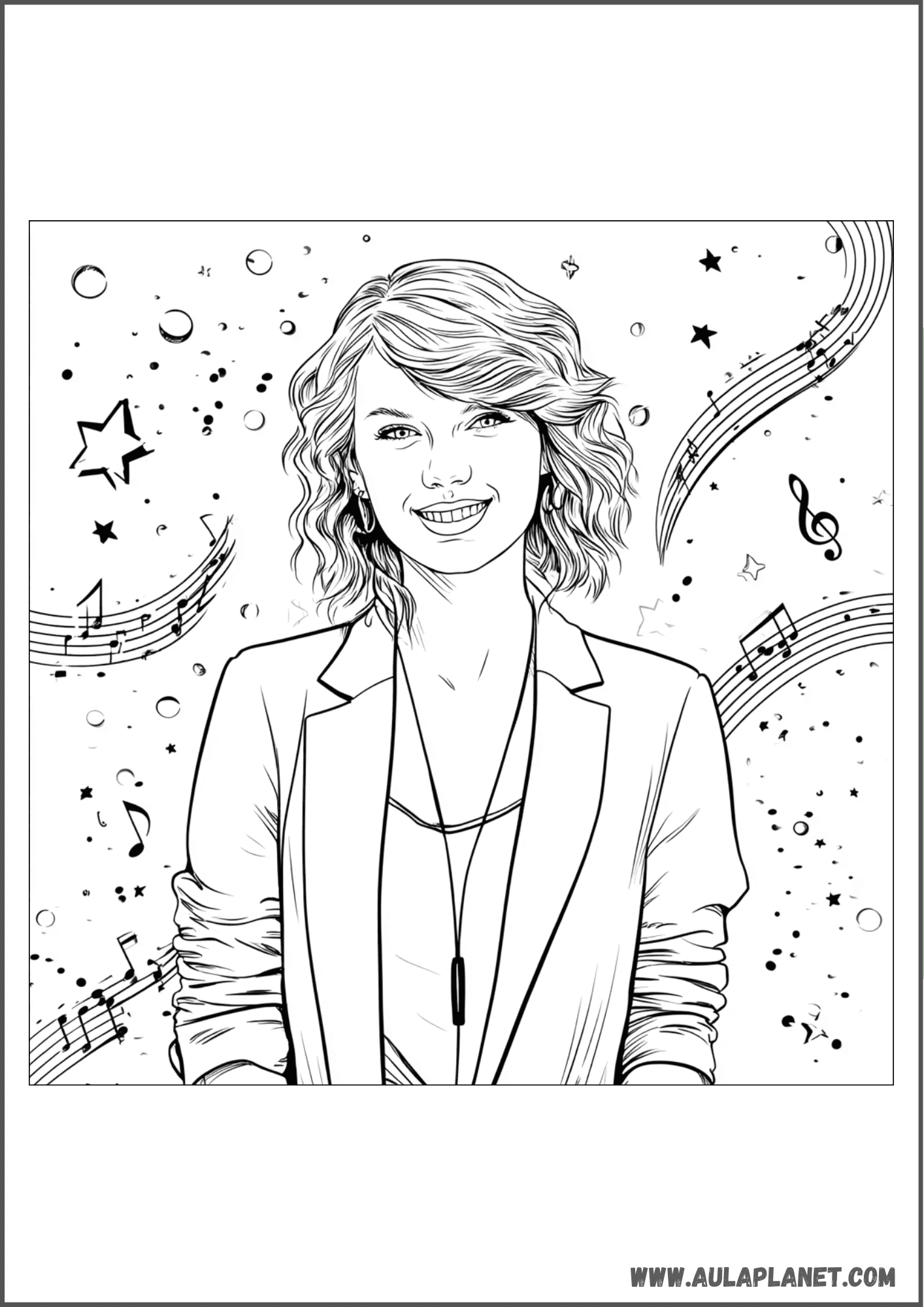 Una página para colorear muy creativa, con Taylor Swift rodeada de estrellas y notas musicales para un resultado más decorativo.
