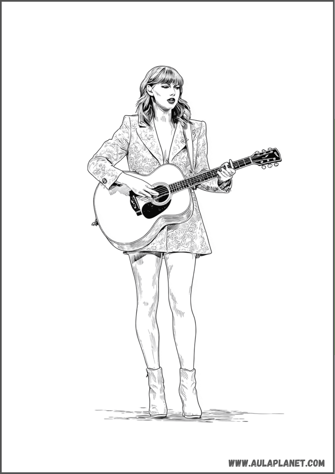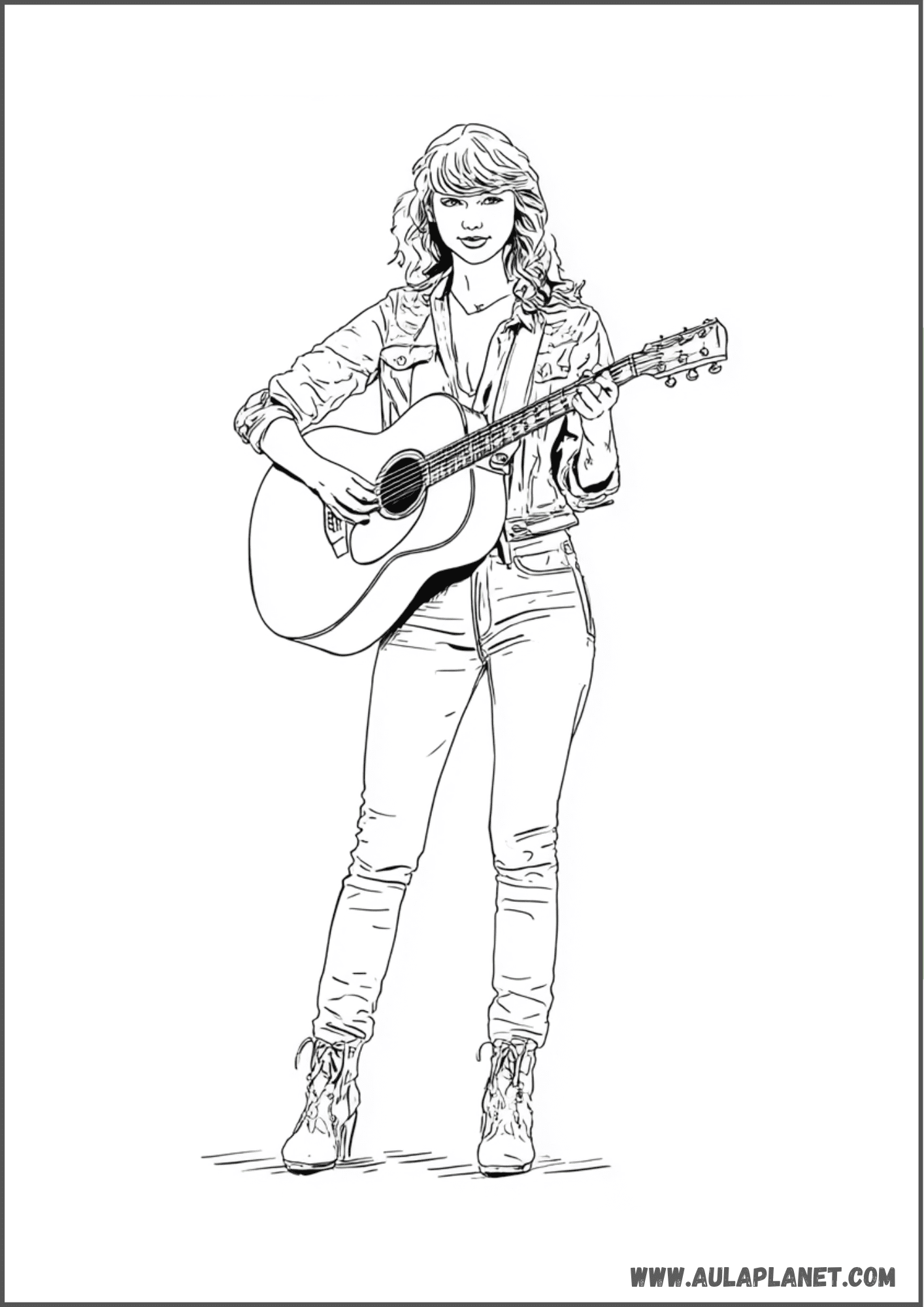 Este dibujo de Taylor Swift con guitarra acústica es ideal para quienes buscan una página para colorear relacionada con la música y los conciertos.