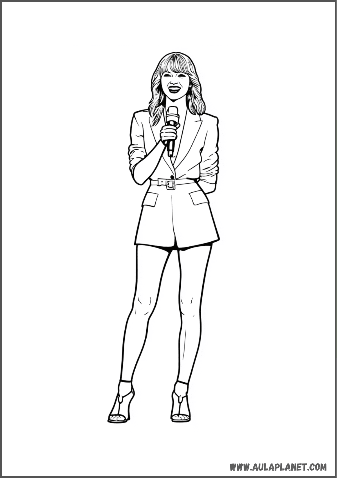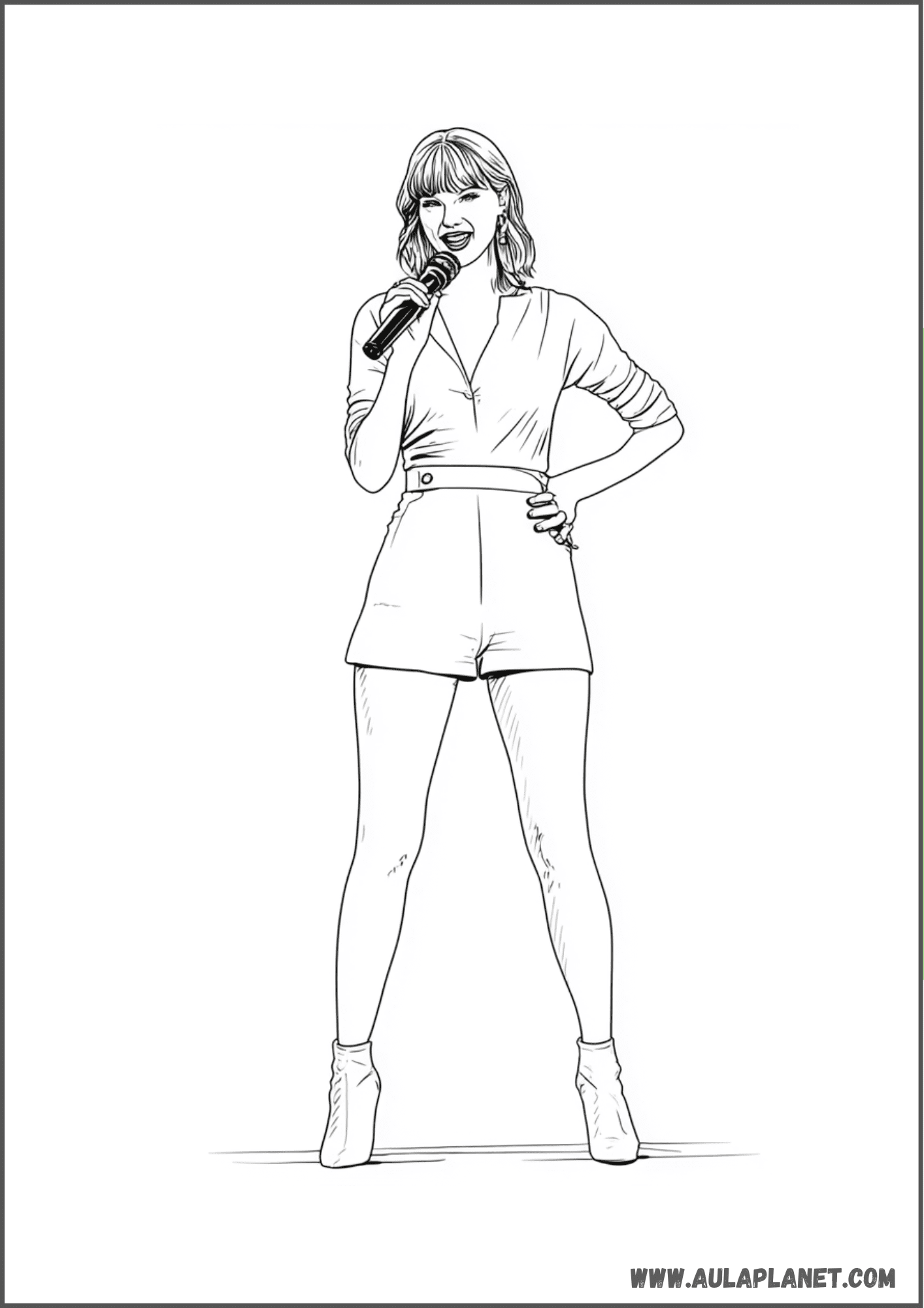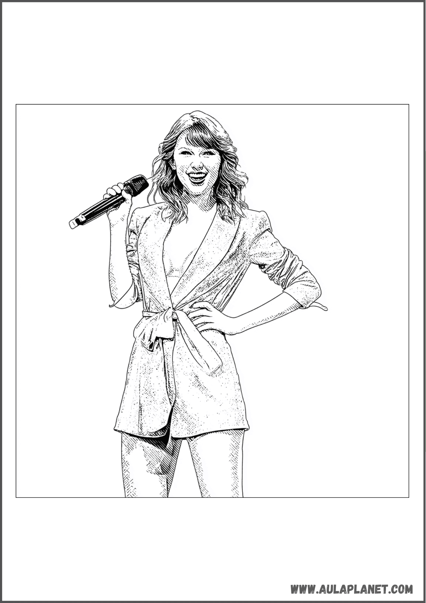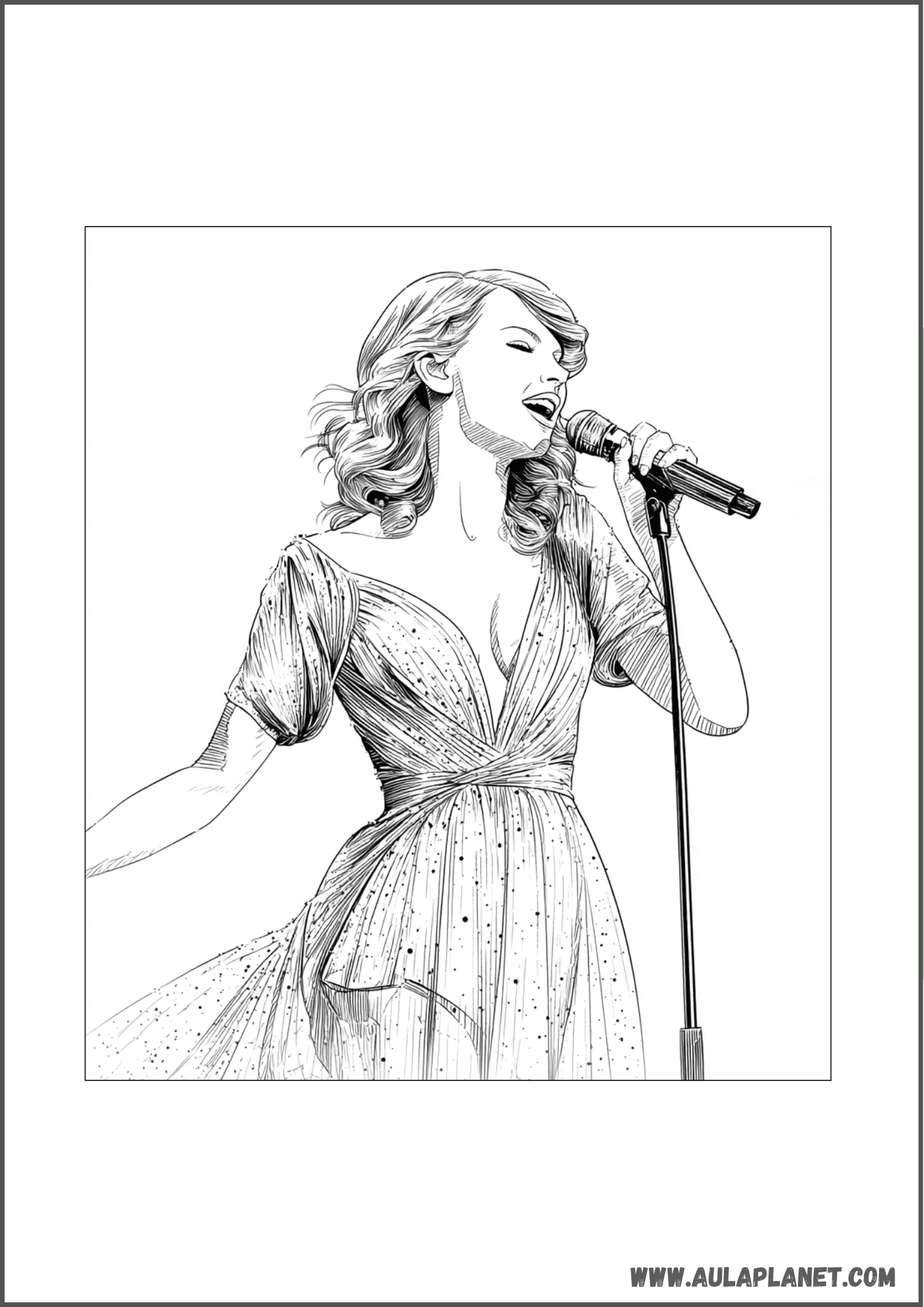 Este diseño muestra a Taylor Swift con un elegante vestido de concierto, ideal para imprimir y colorear con tonos brillantes y creativos.