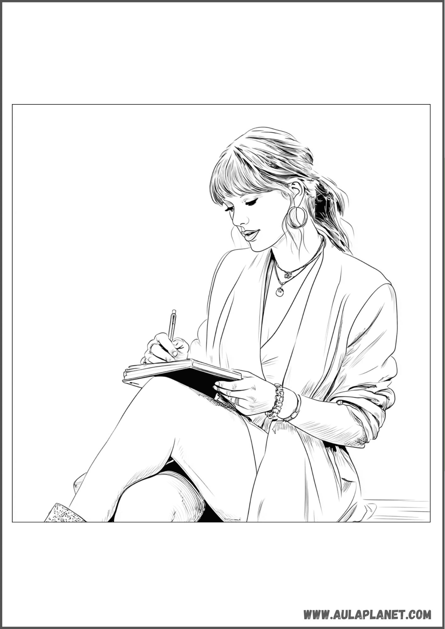 En este dibujo, Taylor Swift aparece sentada escribiendo canciones en una libreta. Es una opción muy bonita para imprimir y colorear.