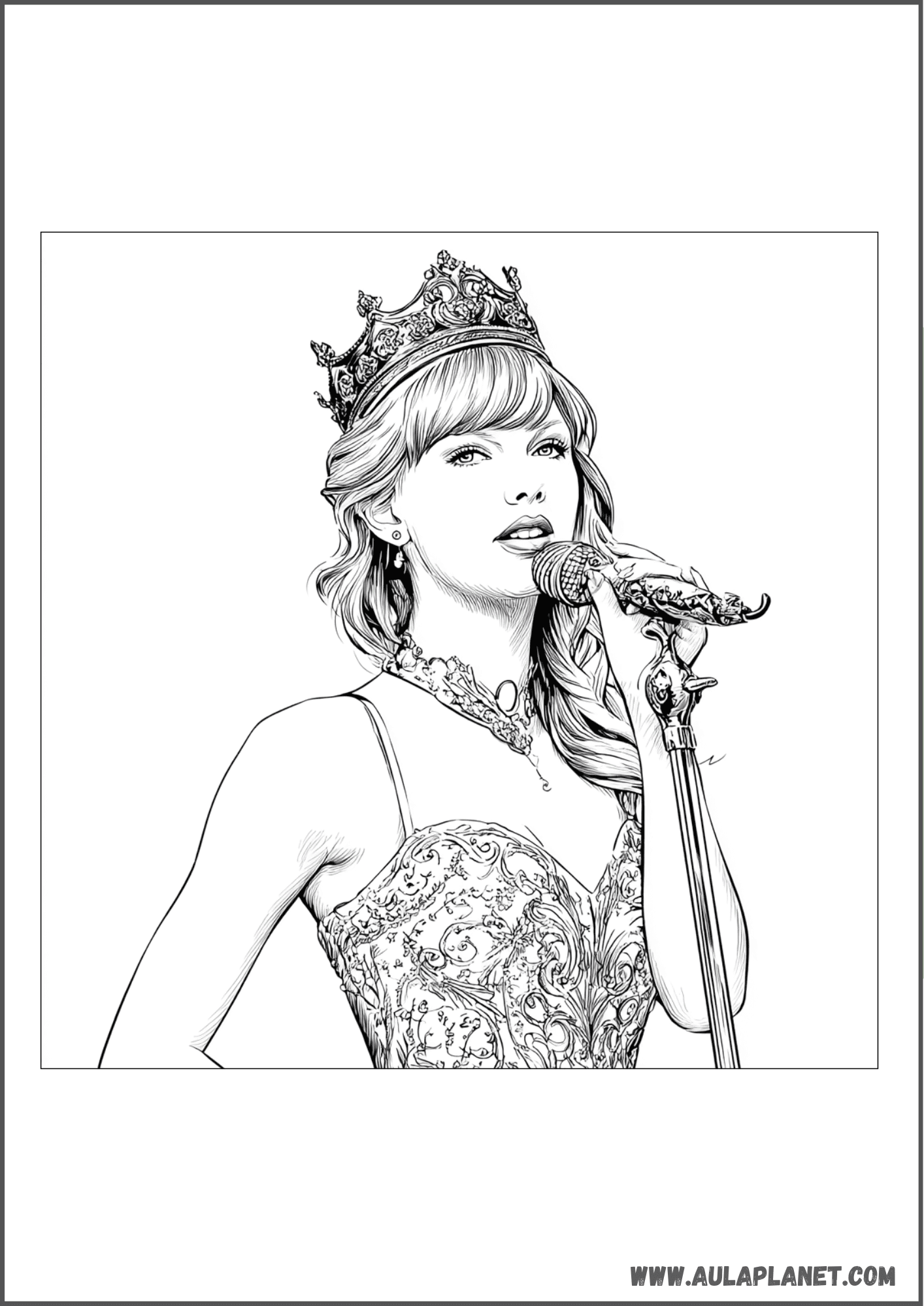 Una versión más fantasiosa y elegante de Taylor Swift para colorear, ideal para quienes disfrutan de vestidos, coronas y dibujos bonitos.