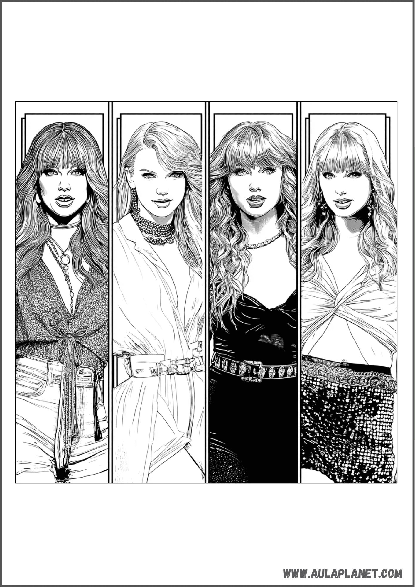 Si buscas dibujos de Taylor Swift para colorear, aquí encontrarás una colección original y divertida con páginas para imprimir gratis inspiradas en diferentes versiones y estilos de una cantante pop muy famosa.