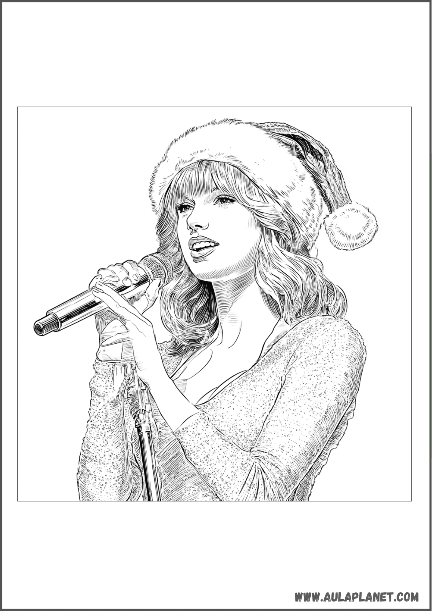 Una versión festiva de Taylor Swift con gorro navideño, perfecta para imprimir durante Navidad y disfrutar coloreando en familia.