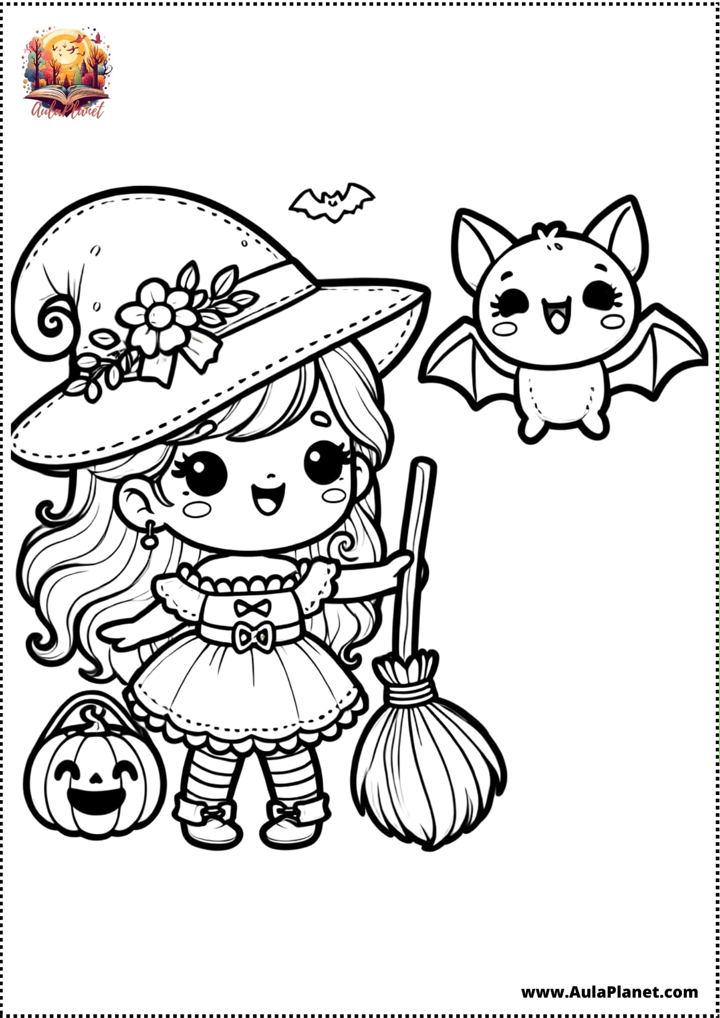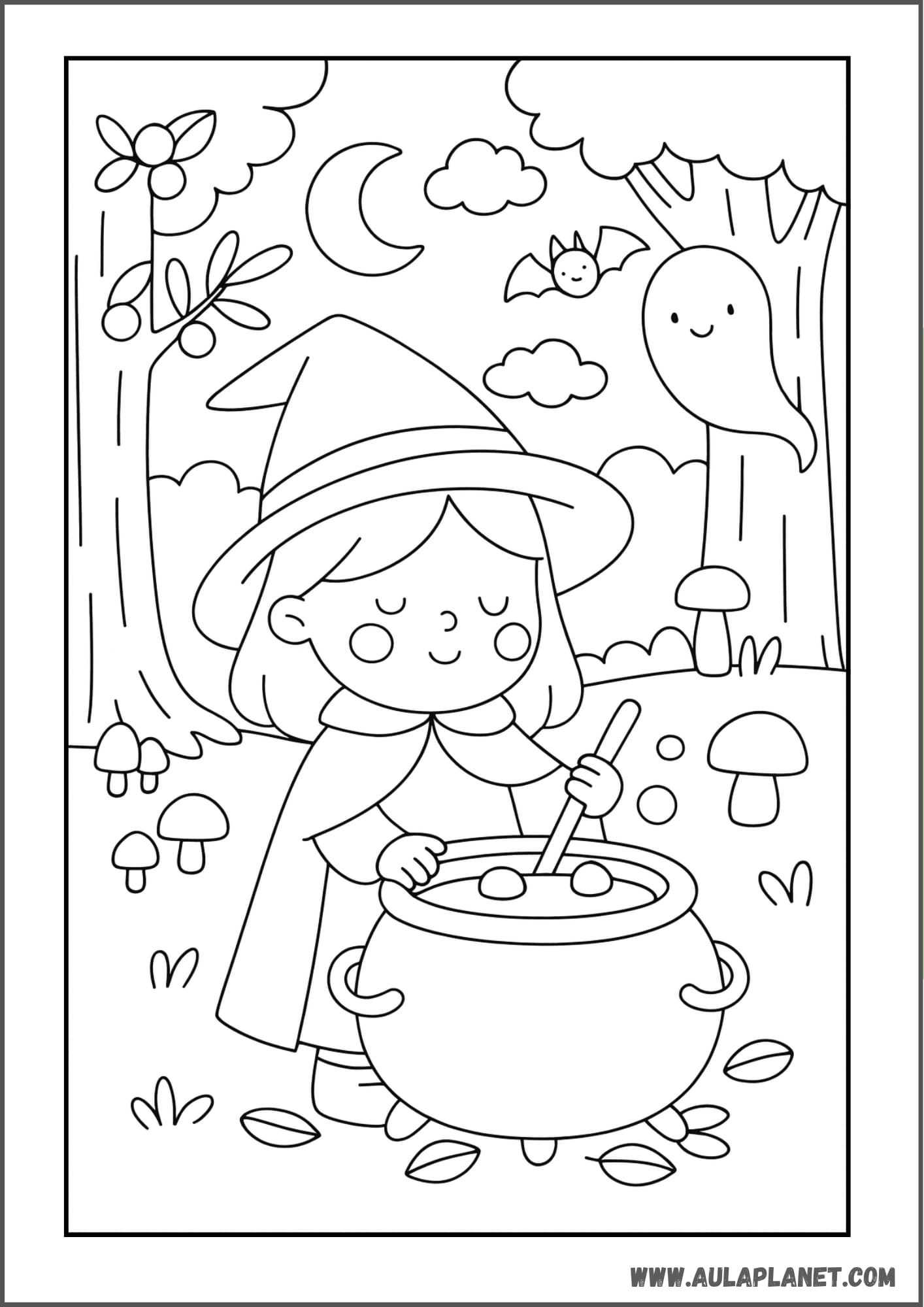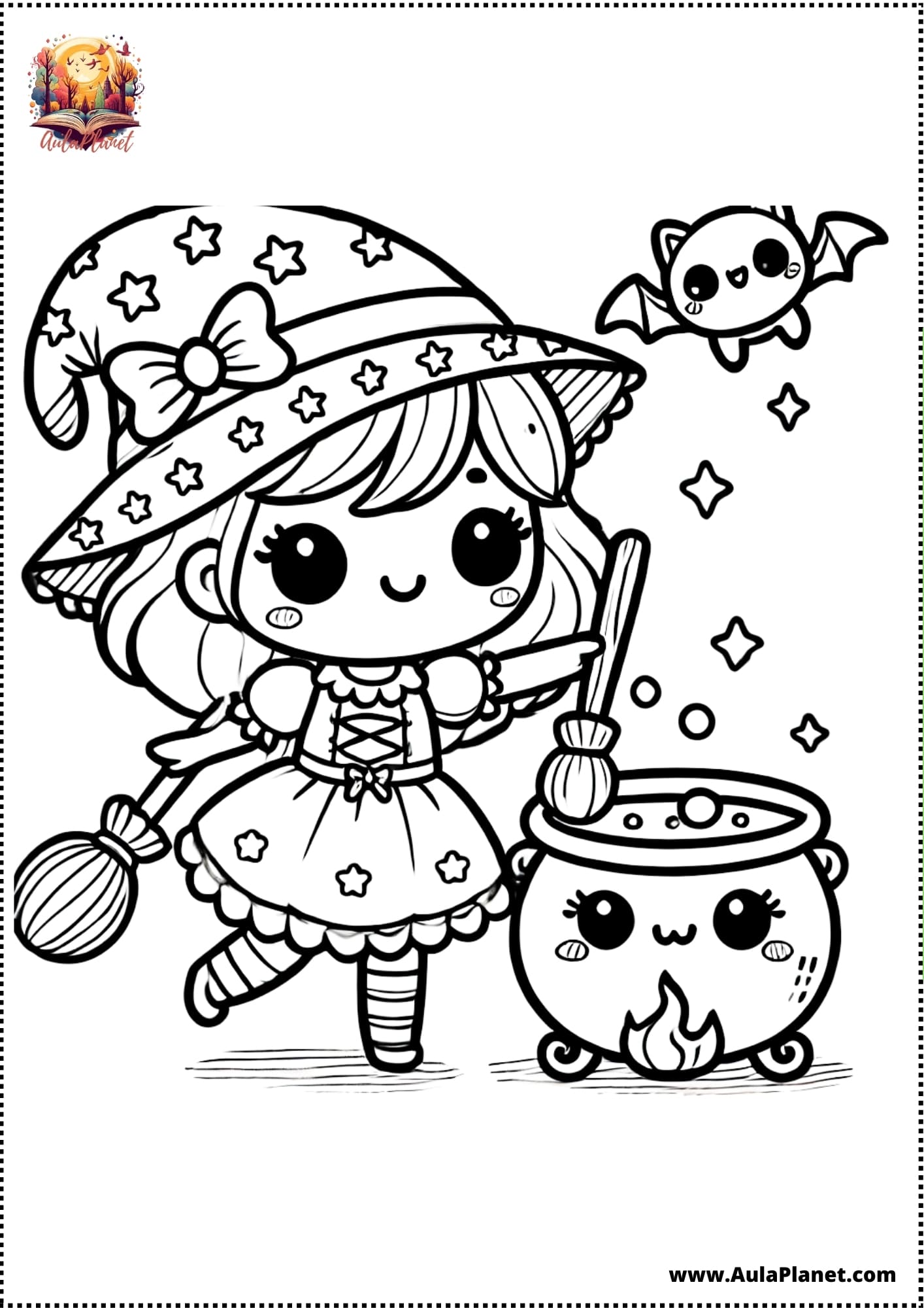 Qui troverai pagine stampabili pronte da scaricare e stampare gratis: streghe kawaii, streghe classiche con cappello a punta, scope volanti, calderoni, gatti neri e lune piene.