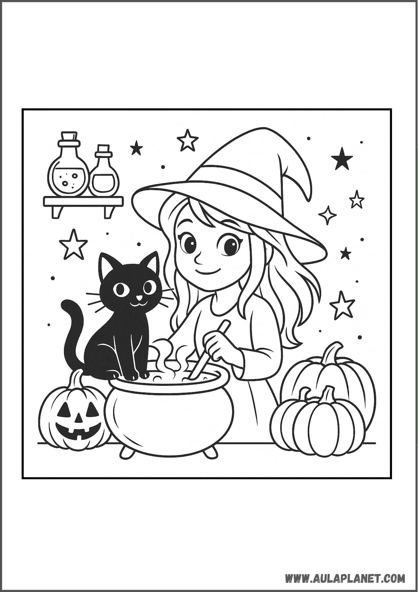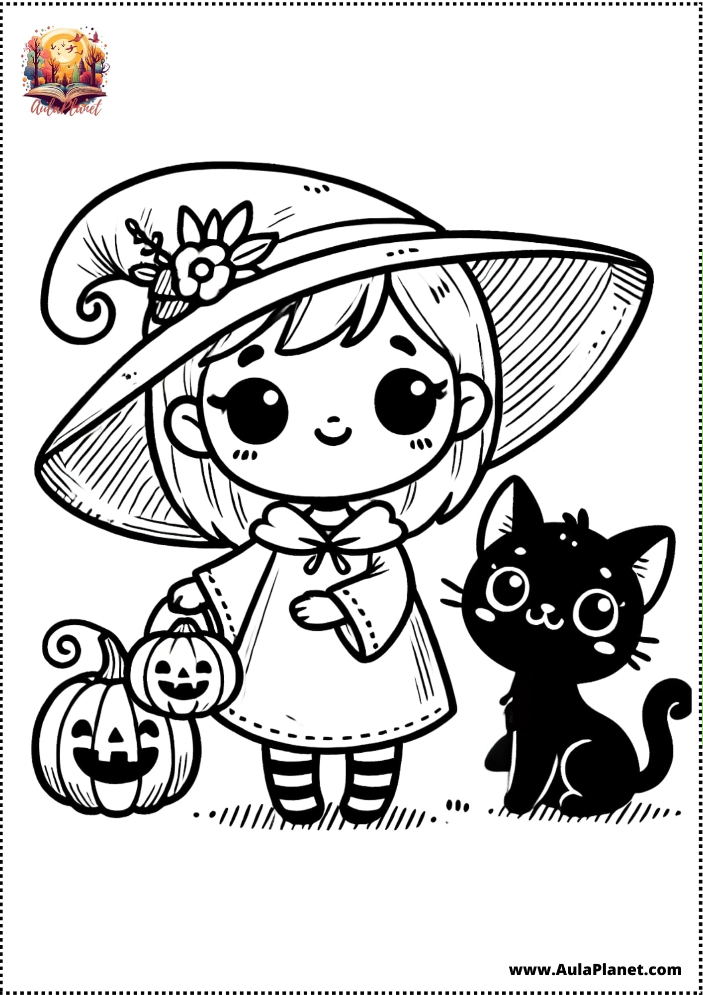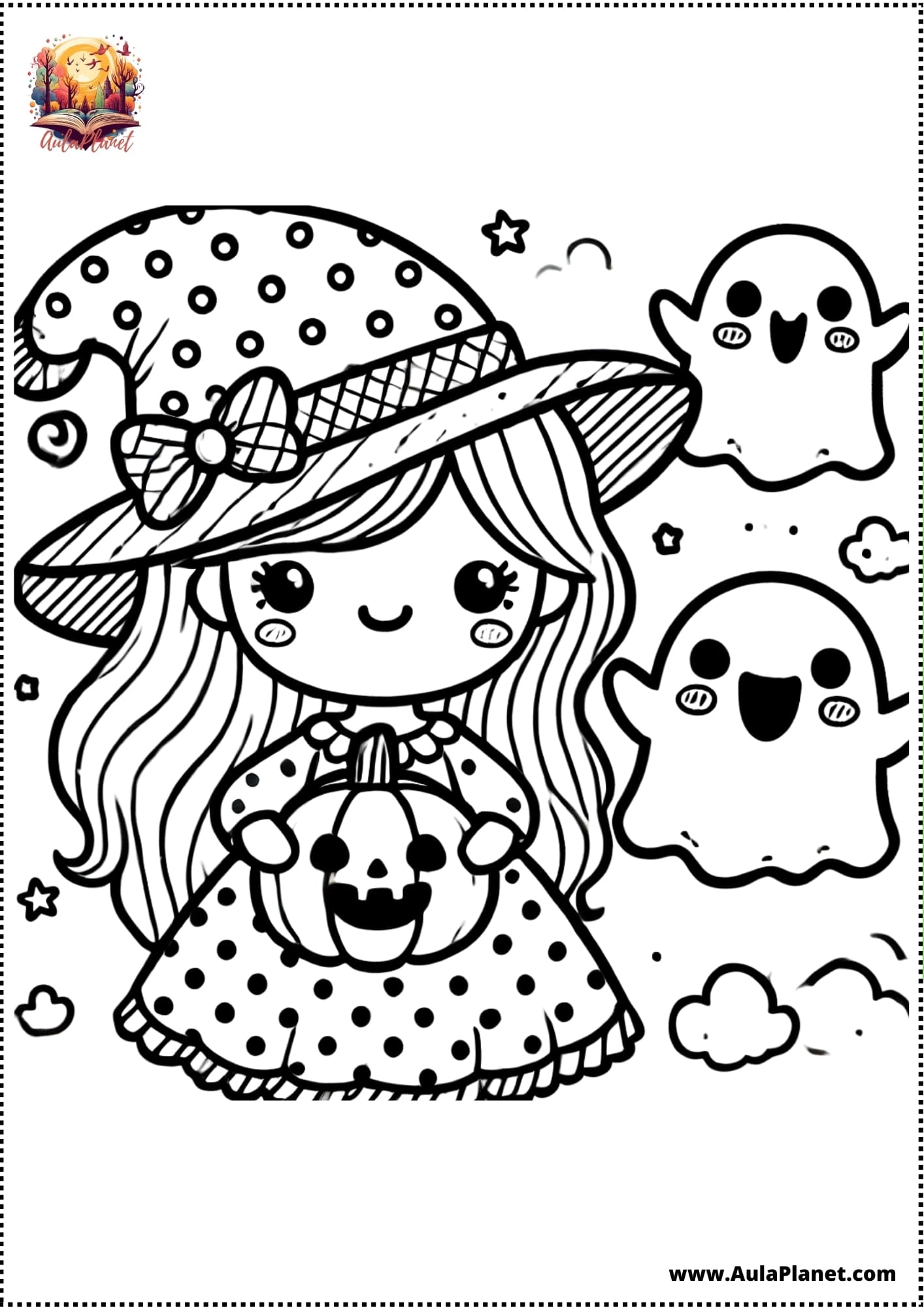 Qui troverai pagine stampabili pronte da scaricare e stampare gratis: streghe kawaii, streghe classiche con cappello a punta, scope volanti, calderoni, gatti neri e lune piene.
