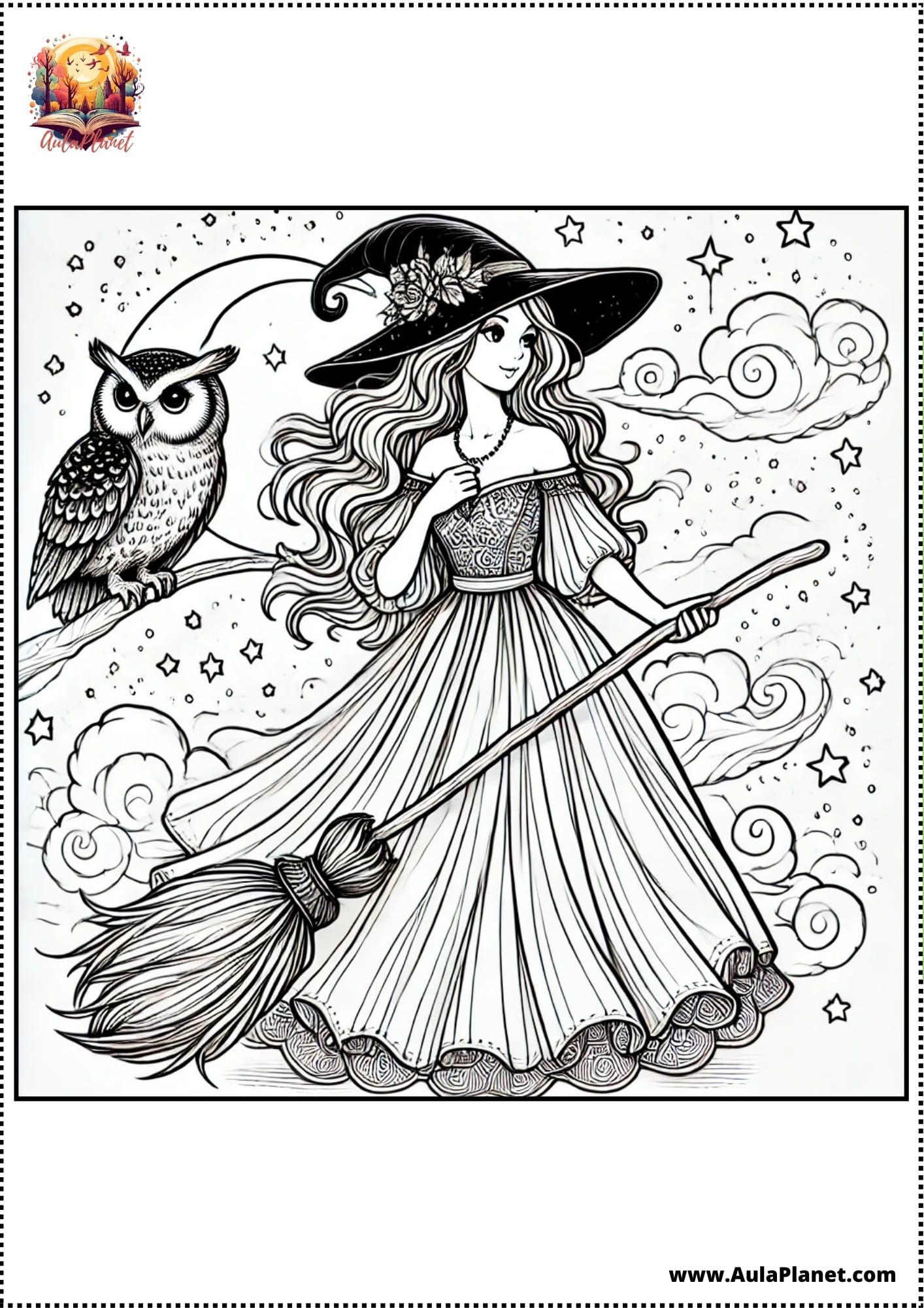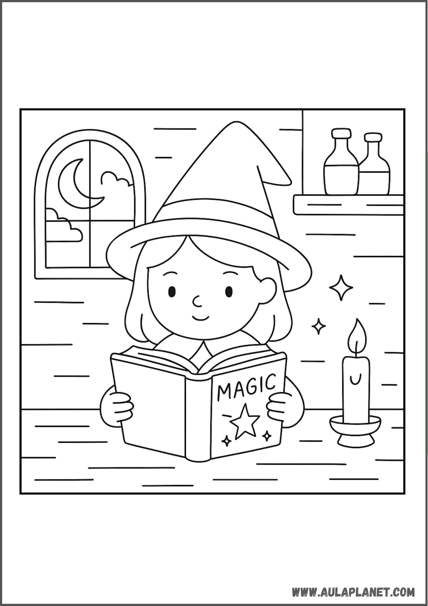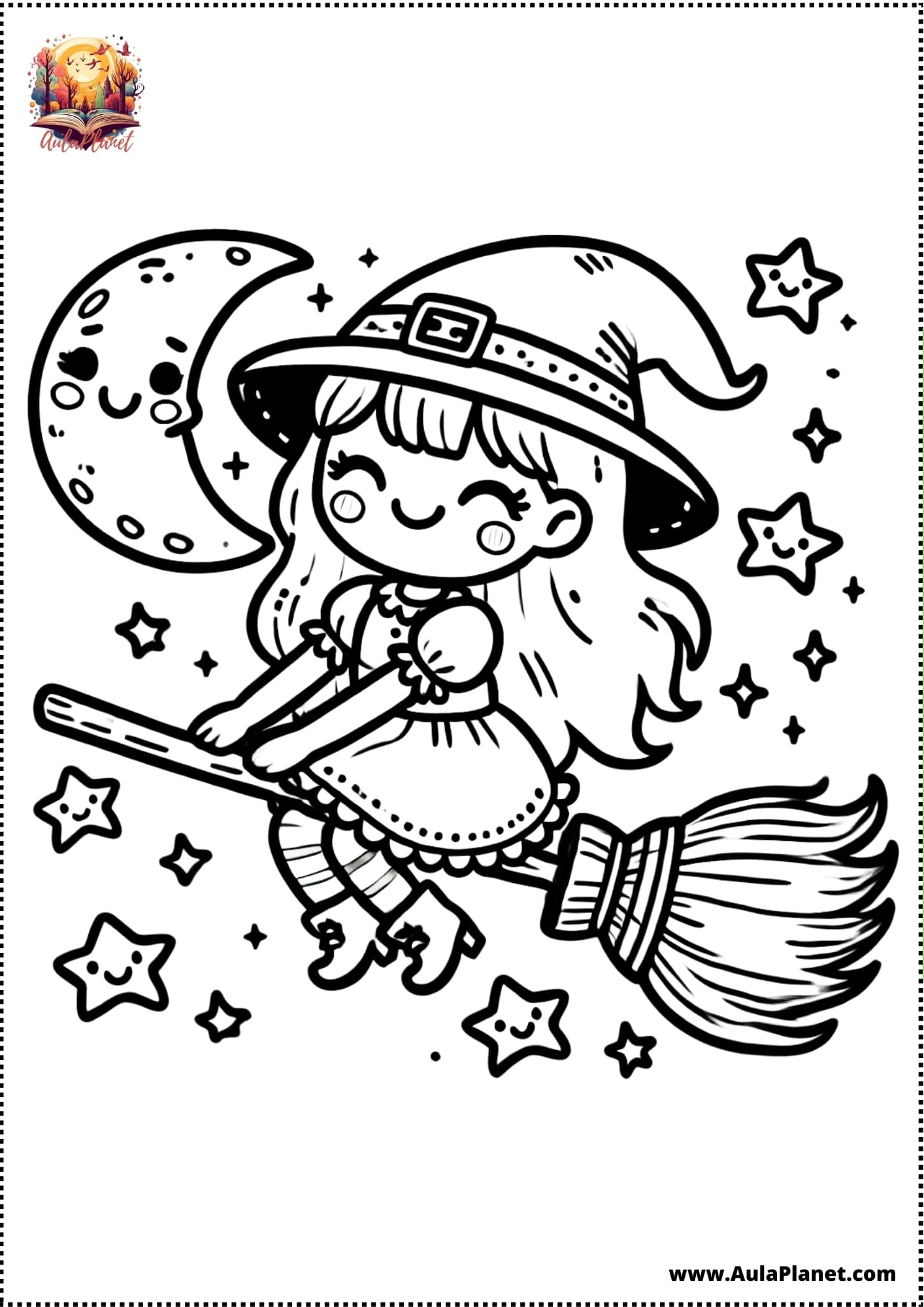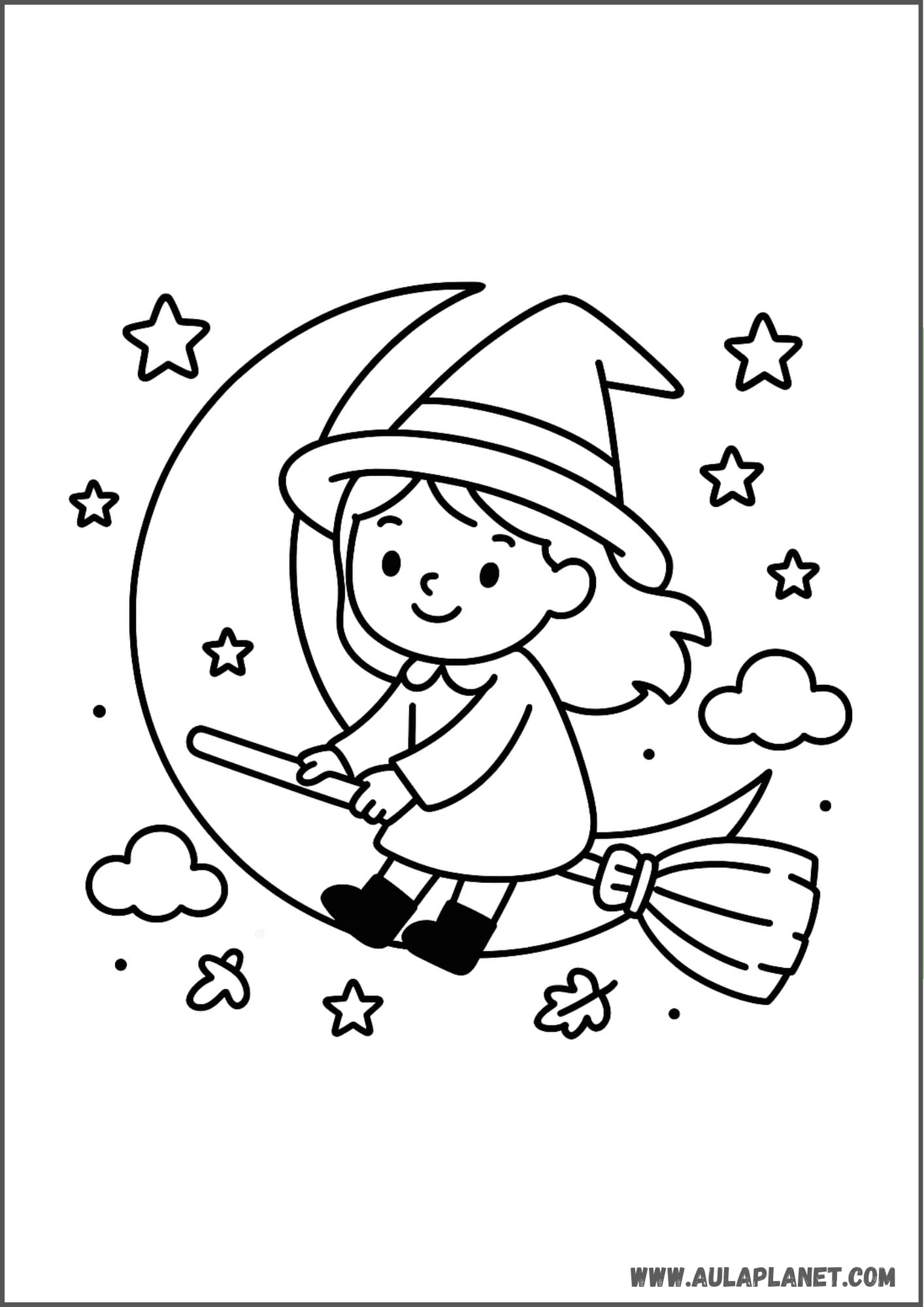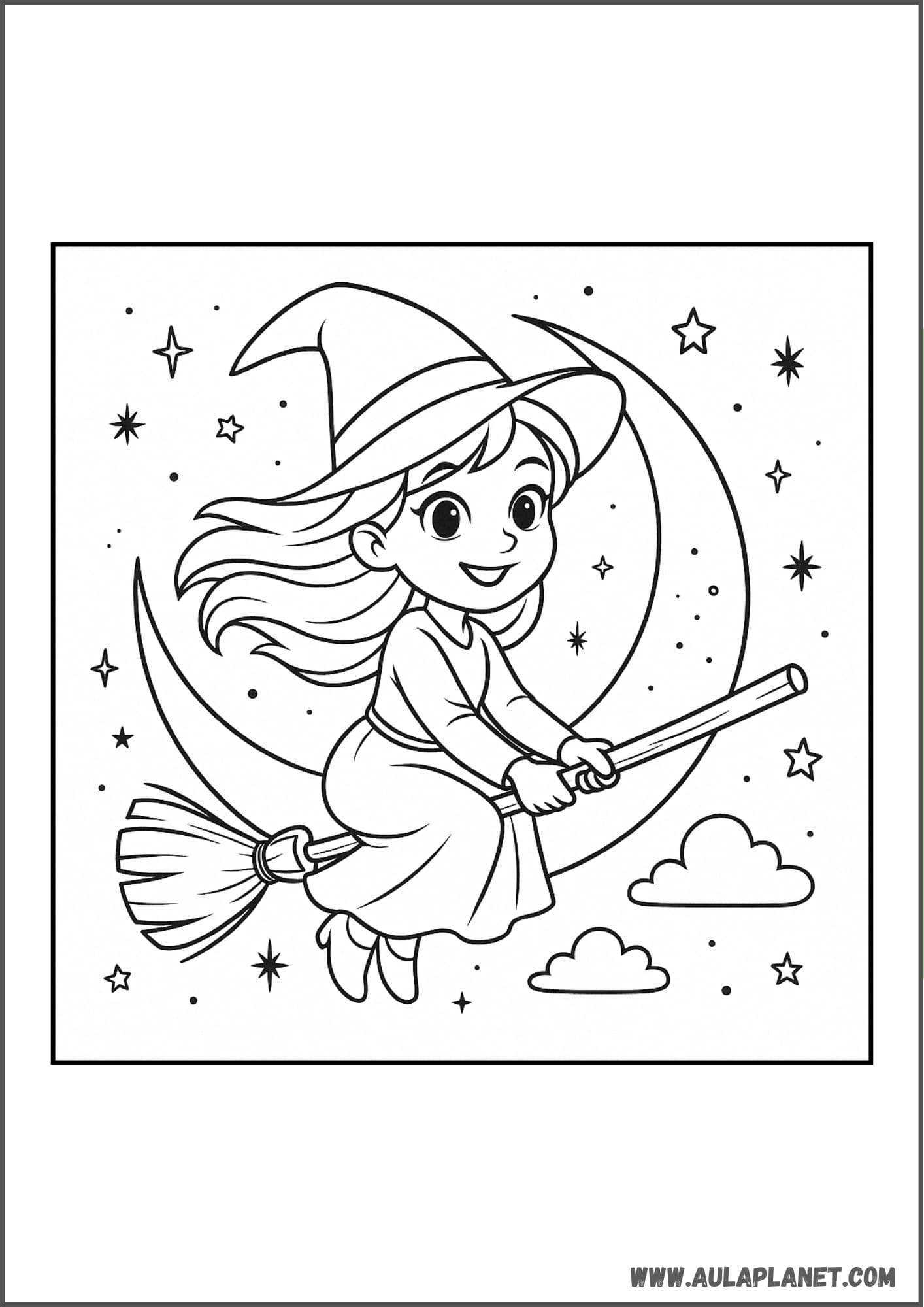 Colora, ritaglia e incolla alla parete — sfondo con la luna, stelle e la tua strega preferita.