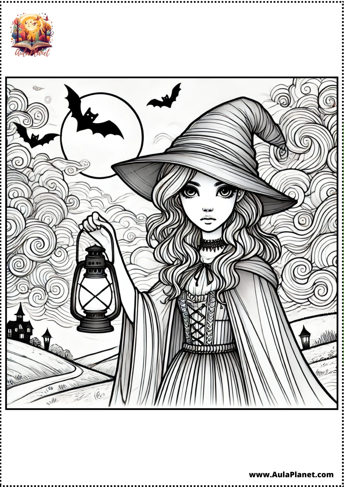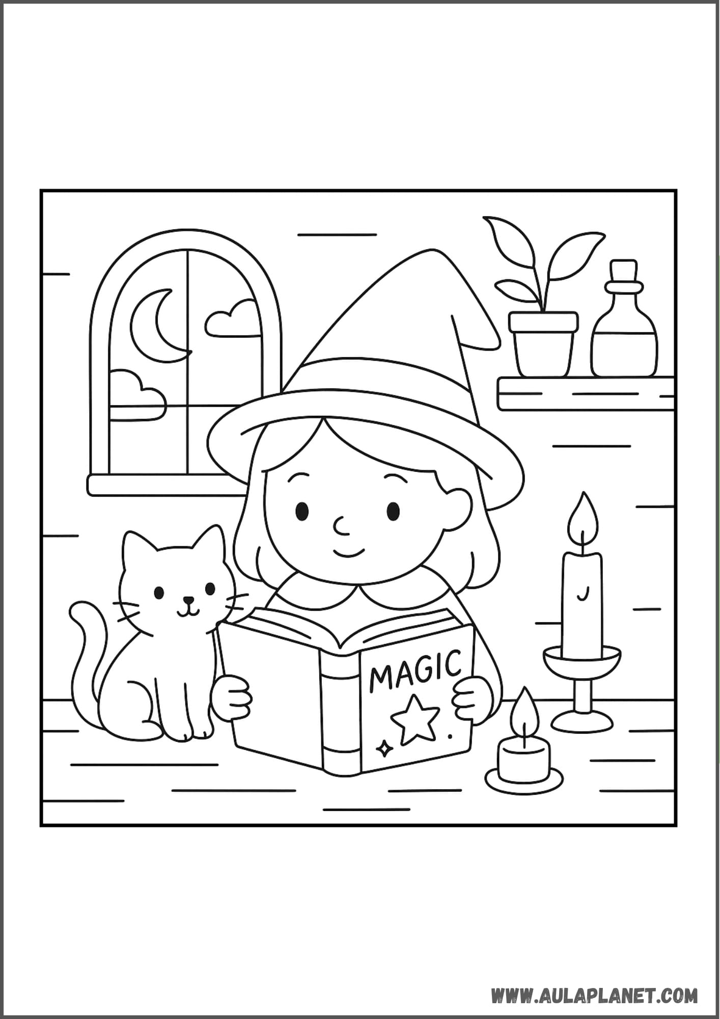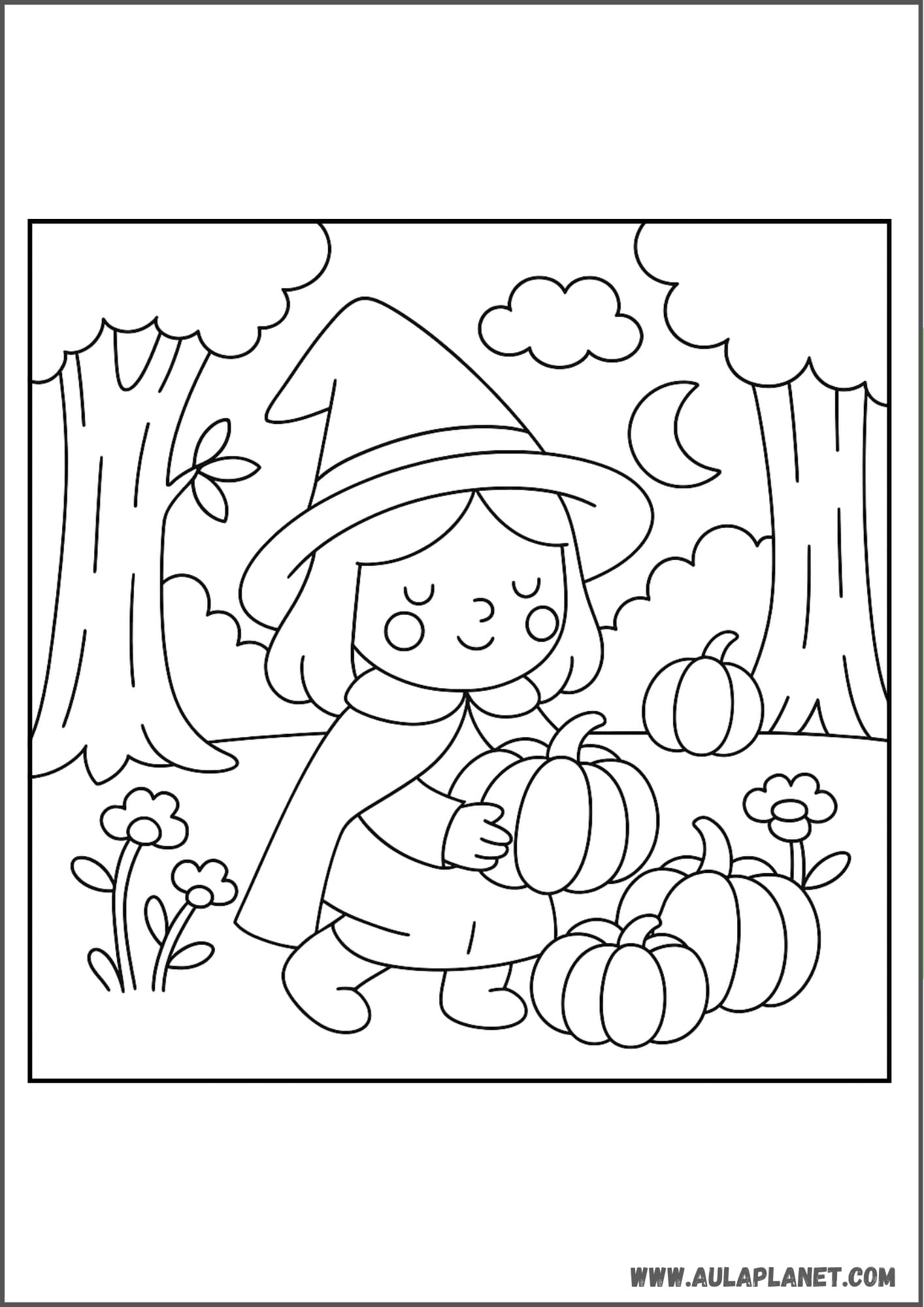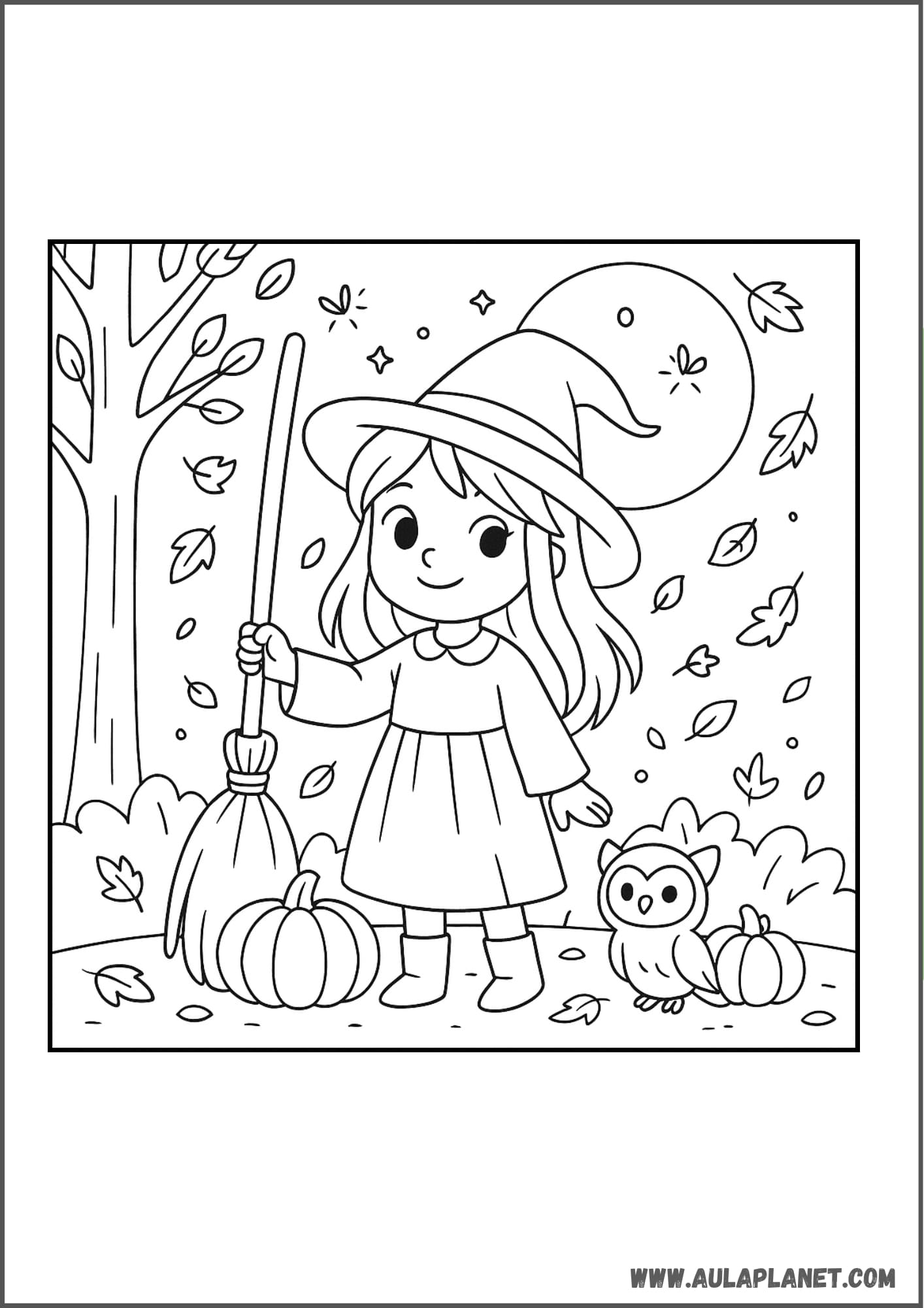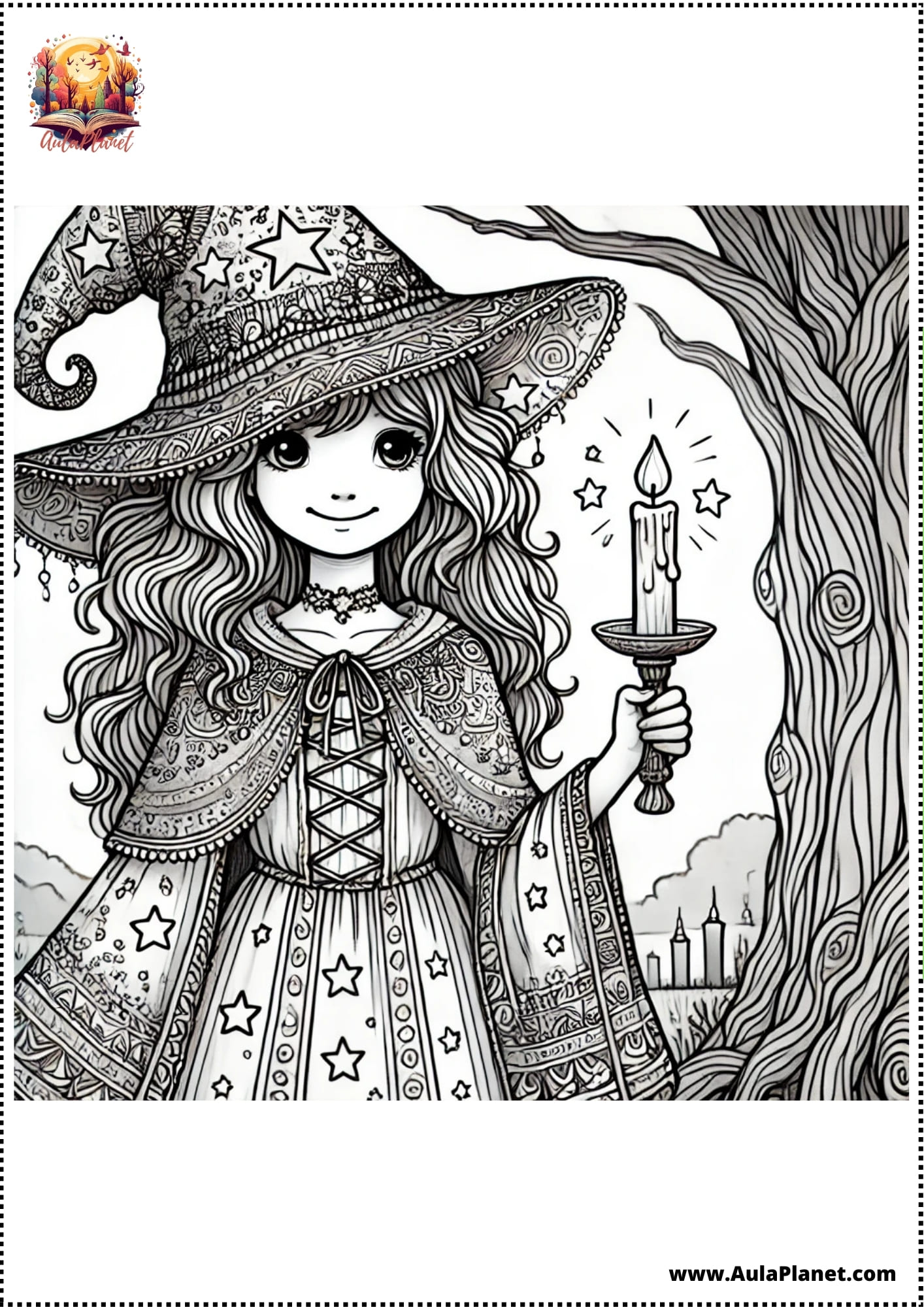 Colora, ritaglia e incolla alla parete — sfondo con la luna, stelle e la tua strega preferita.